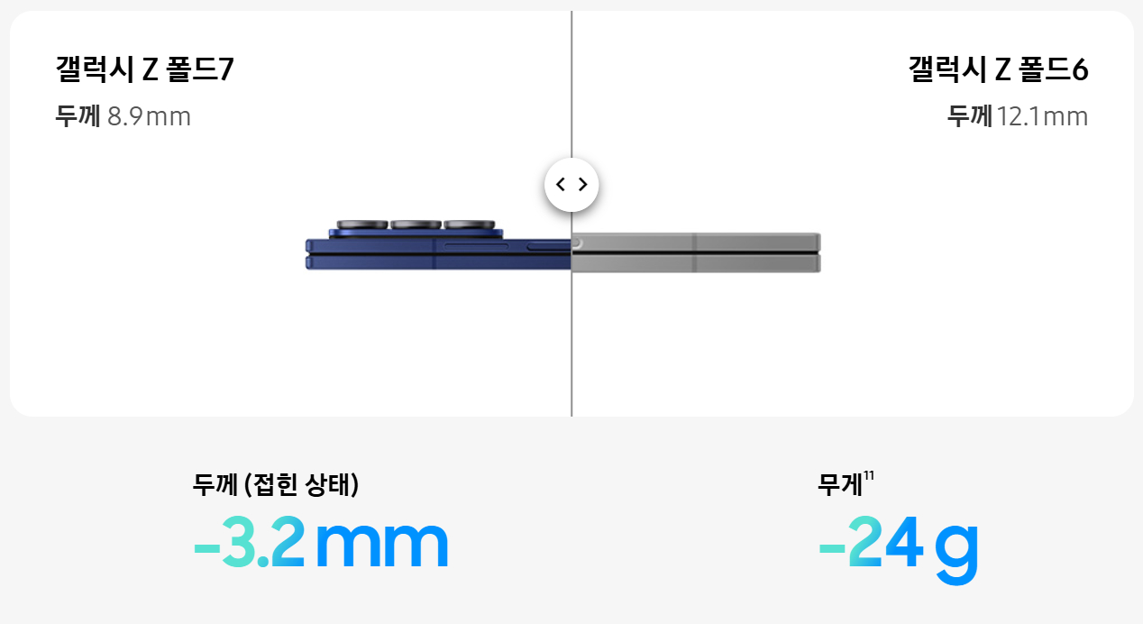 - 얇고 가벼워진 두께와 무게: 폴드 7은 접었을 때 8.9mm, 펼쳤을 때 4.2mm로 폴드 6 대비 얇아졌습니다 (폴드 6는 접었을 때 12.1mm, 펼쳤을 때 5.6mm). 무게 또한 215g으로 폴드 6(239g)보다 10% 정도 가벼워져 휴대성이 크게 향상되었습니다.